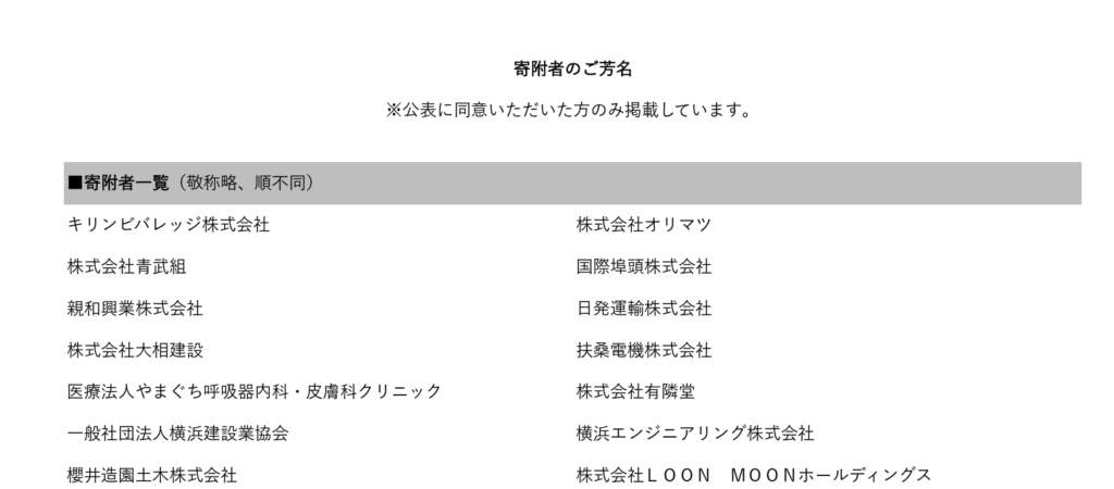 全国の名だたる企業が名を連ねる中で、医療機関として唯一、やまぐち呼吸器内科・皮膚科クリニックが寄附しております(2025年10月6日)。