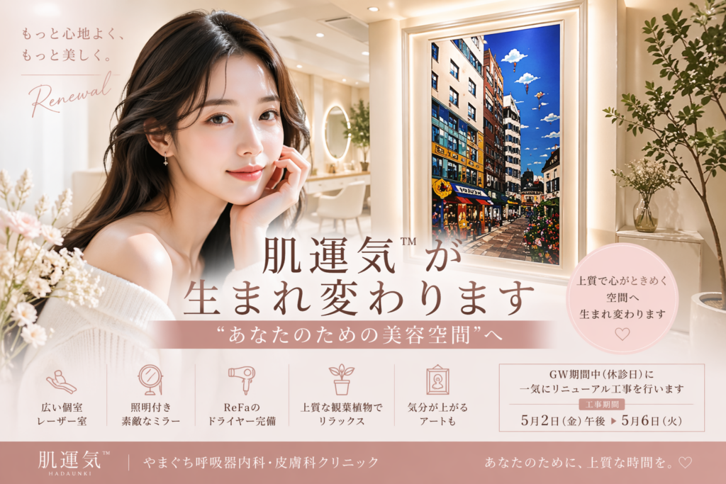 ※「肌運気」は、やまぐち呼吸器内科・皮膚科クリニックにおける美容皮膚科部門のブランド・コンセプト名です。医療機関の正式名称ではありません。掲載内容は一般的な美容皮膚科情報のご案内であり、治療の適応や効果には個人差があります。実際の診療では、医師の診察のうえで適切な治療をご提案いたします。