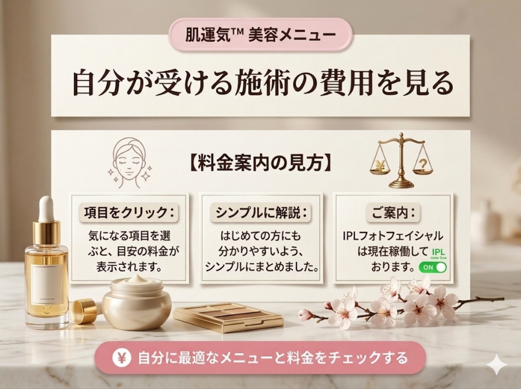 気になる美容施術の費用はこちら|肌運気™美容メニュー料金