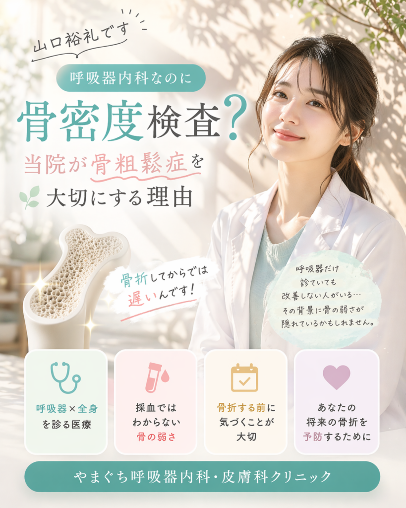骨粗鬆症は、骨折してから初めて見つかることが少なくありません。 しかし本当は、骨折する前に見つけることが大切です。 この記事では、なぜ呼吸器内科で骨密度測定を行うのかを、患者さん向けにわかりやすくお伝えします。