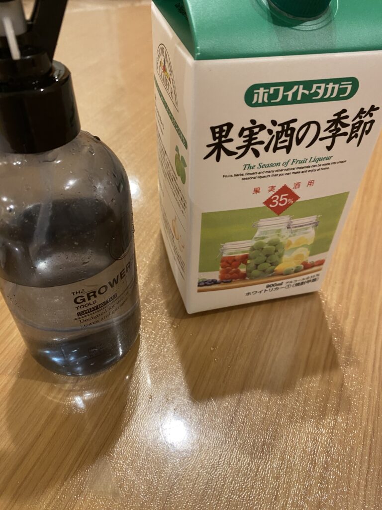 ホワイトリカー(果実酒用の焼酎)をスプレーして消毒しました👇